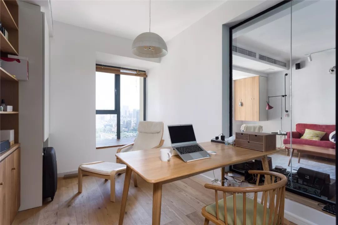 打掉客廳與書房的一小面墻體,取而代之的是用玻璃來作為兩個(gè)空間的隔斷,空間瞬間就變大變亮了起來。