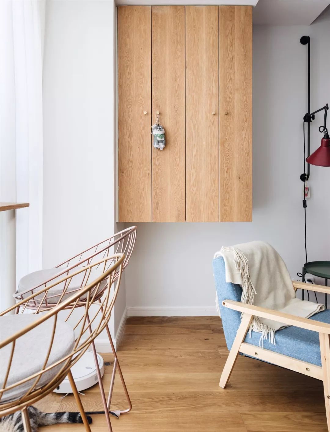 打通客廳與陽臺(tái)的墻體,把陽臺(tái)做成一個(gè)休閑區(qū),同時(shí)墻的另一邊還安裝了儲(chǔ)物柜,讓陽臺(tái)在這個(gè)家變得更具有使用價(jià)值。