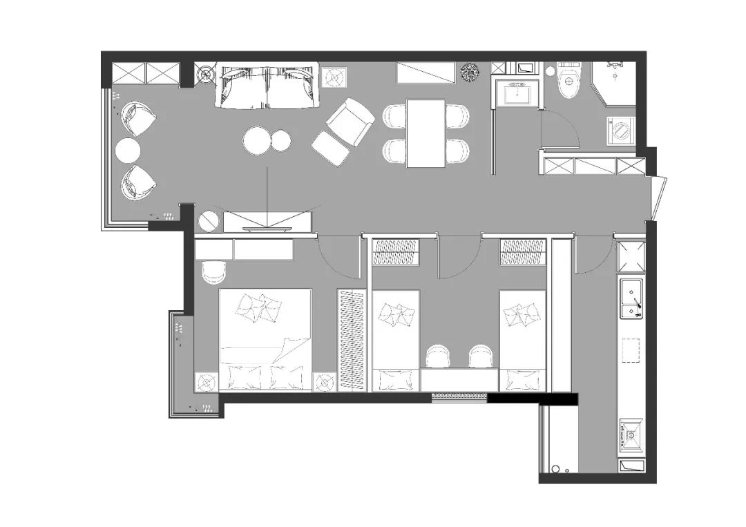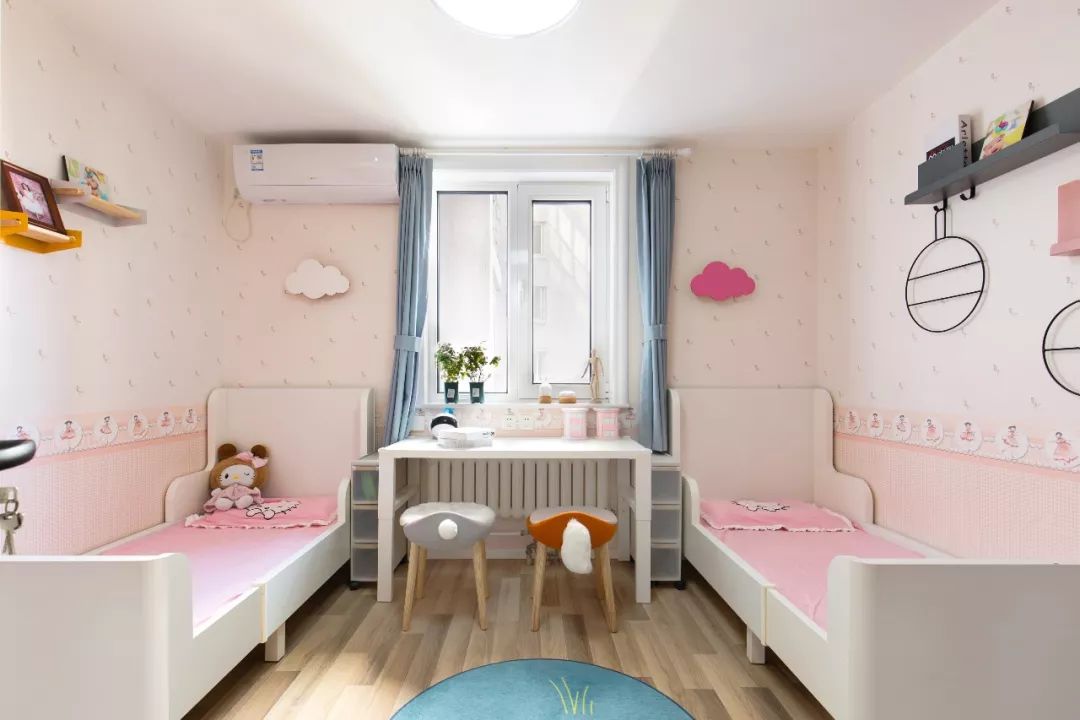 女兒房是重點規(guī)劃設(shè)計的空間,兩張小床分別靠墻擺放,提升安全感。靠窗是孩子們的學(xué)習(xí)書桌,中間留出了足夠的空間給孩子們玩耍。