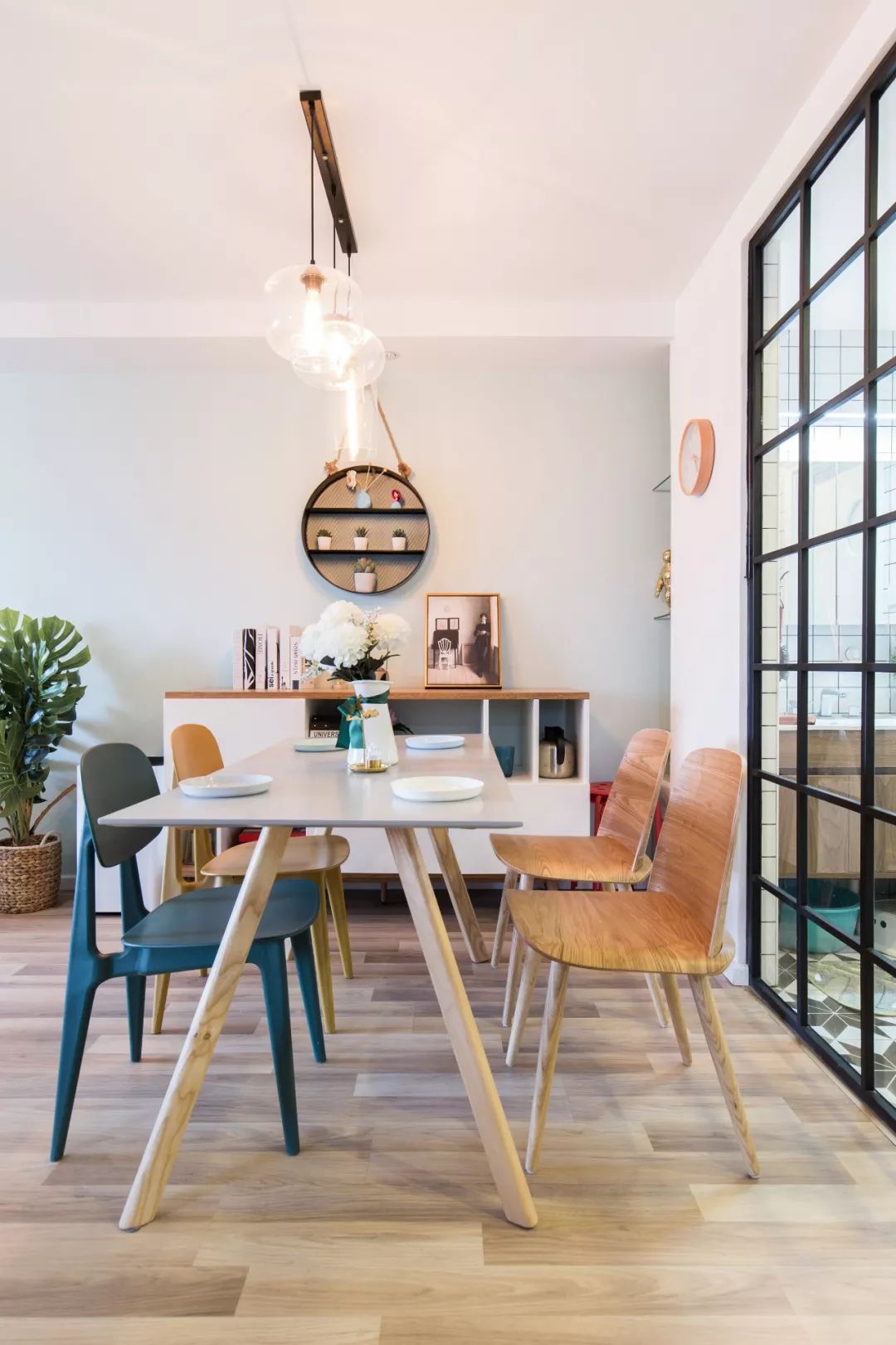 餐廳與衛(wèi)生間干區(qū)的分隔采用了黑色鐵藝玻璃隔斷,空間的采光與通透度都得到提高。