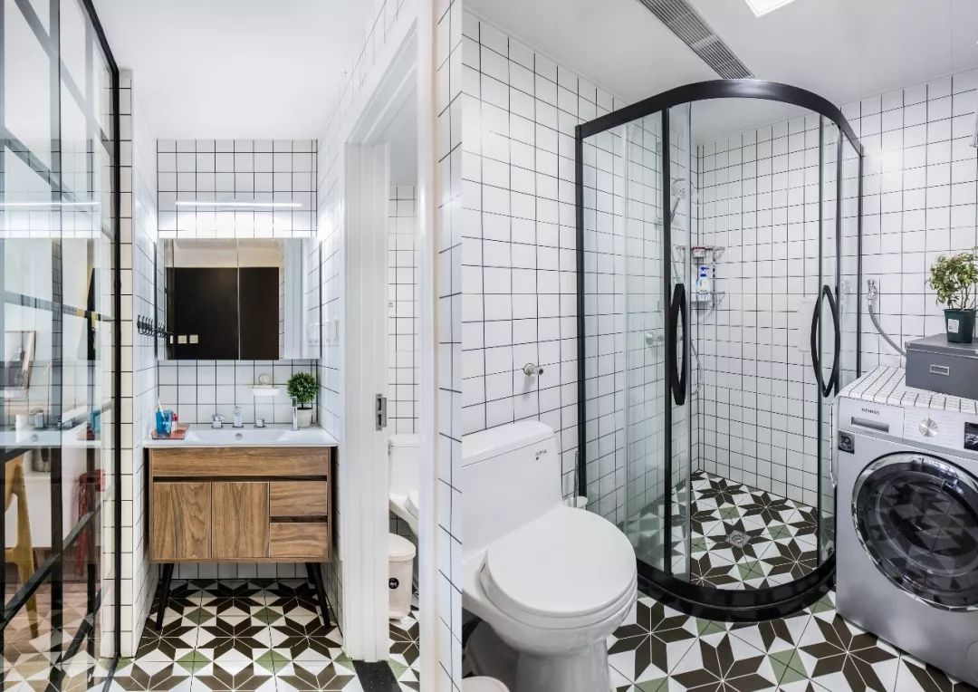 干濕分離的衛(wèi)生間設(shè)計,使用大量現(xiàn)代的元素,原木色的干區(qū)臺盆柜,與白色瓷磚的結(jié)合,加上黑色色金屬拉手和柜腳,使整個空間更加飽滿。