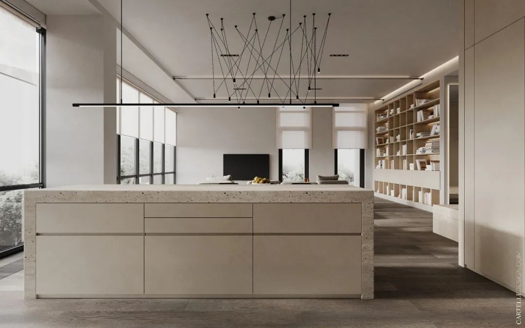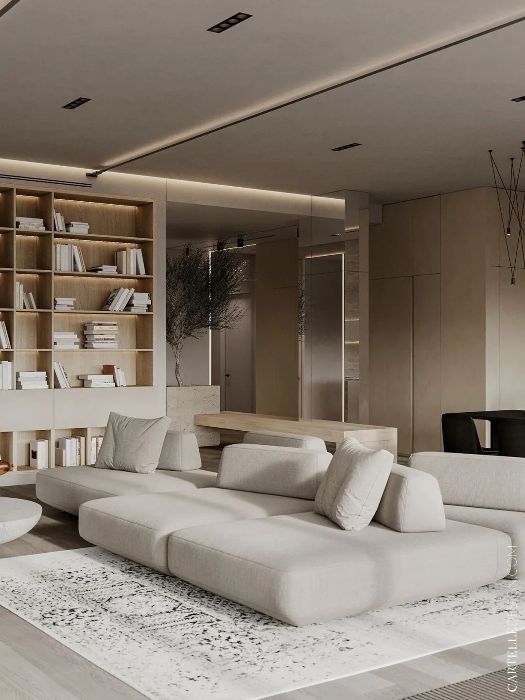 該住所的主要優(yōu)點是自由規(guī)劃、高挑的天花板、帶玻璃窗、所有房間以及浴室都是落地窗。客廳一整面墻的大書架,不管你愛不愛看書,也是實用的收納方案,也可以做置物架。
