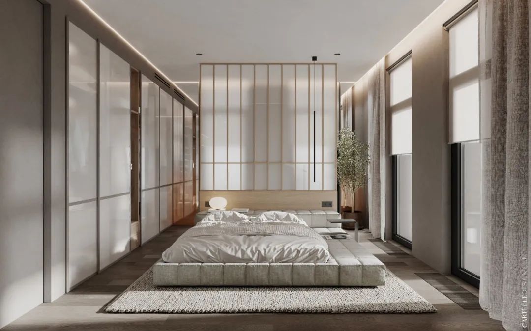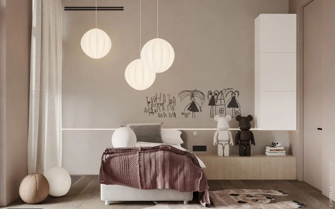 在公寓的私人部分有一個主臥室、一個更衣室和一個淋浴間、兩個兒童房、一個浴室和一個洗衣房的單一區(qū)域。