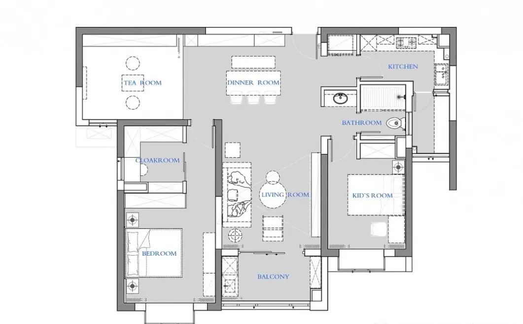 兒童房用了藍色的波浪板,給孩子的空間增加它獨特的一份氣質。床頭用了灰色的軟包。