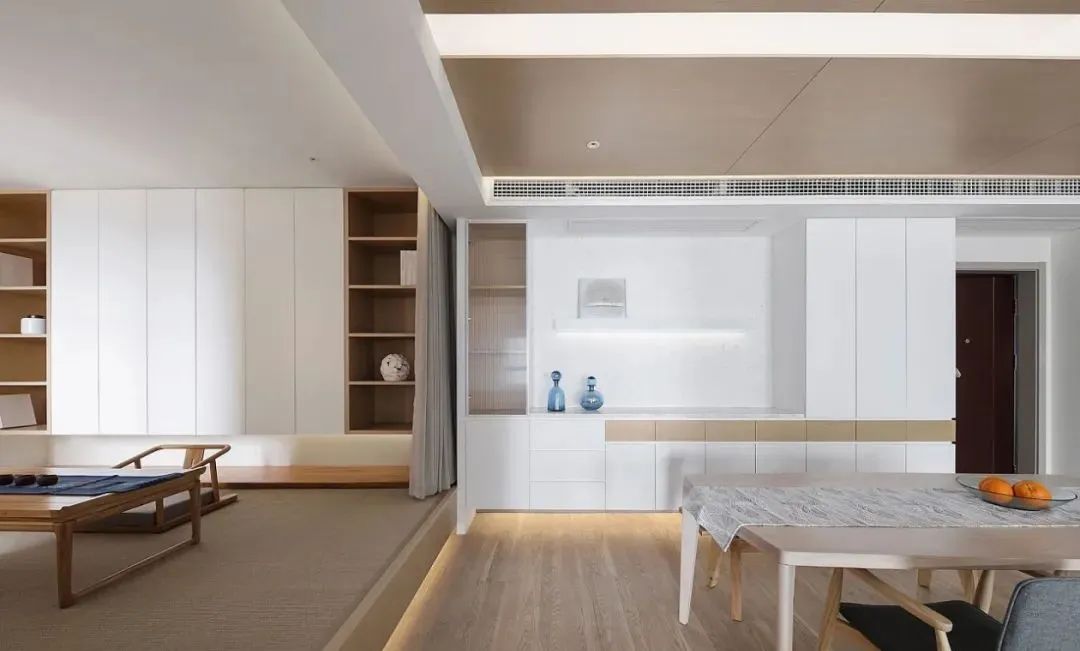 茶室地臺與餐廳之間用窗簾做了隔斷,能夠偶爾滿足來客人居住的要求,平時敞開著更通透,開放式地臺茶室的設計,形式新穎時尚,還充滿韻味。