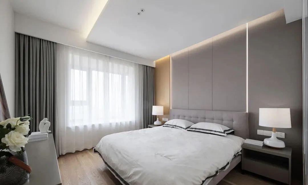 主臥沿用了客廳的原木色系,在這個基礎上增加了灰色系的床頭背景,讓臥室空間多一分靜謐。床頭背景用線性燈作為裝飾面的一部分,既起到了分割比例的作用,也能作為間接照明來使用。