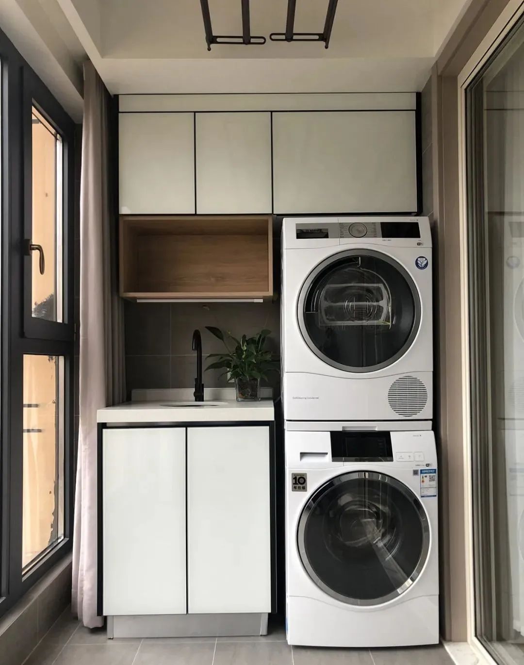 陽臺柜柜門,選擇了比較好打理的玻璃面板,洗烘上下疊放,利用空間盡可能做到功能完備,整齊合理。