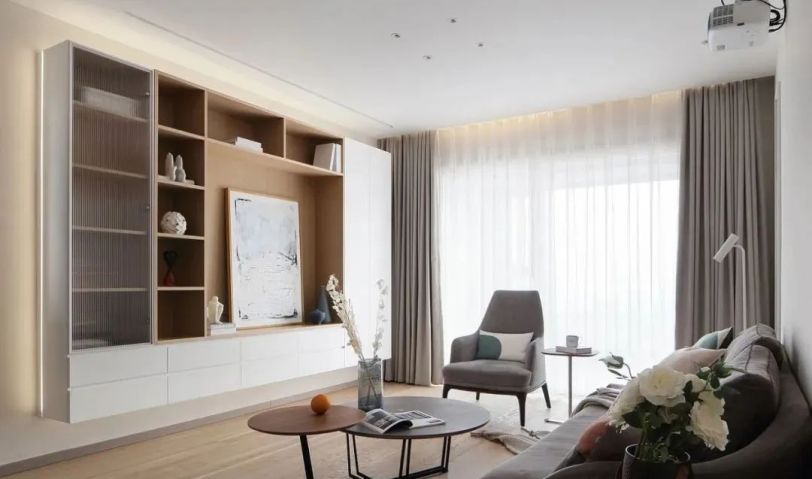 客廳,沒有做傳統的電視背景墻,用了一個收納柜的形式,作為客廳的一個視覺點。投影幕布在吊頂前做了預埋,完美的融合在吊頂里。
