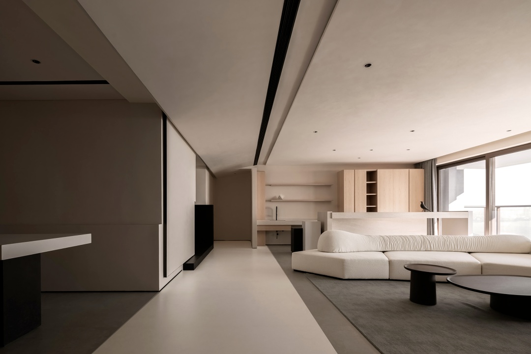 隨著視線的深入,墻面與天花一體的微水泥材質,顏色為設計師私人調配獨一無二的白,整個空間仿佛新生了第二層“皮膚”,自然低調。豐富的空間語言由多層次體塊構成,糅合了各種材質以達到視覺上的完美平衡。在陽臺眺望,眼前美景似乎有點恍惚,才想起要把視線轉回室內,回眸此處光景筑造的極簡居所。