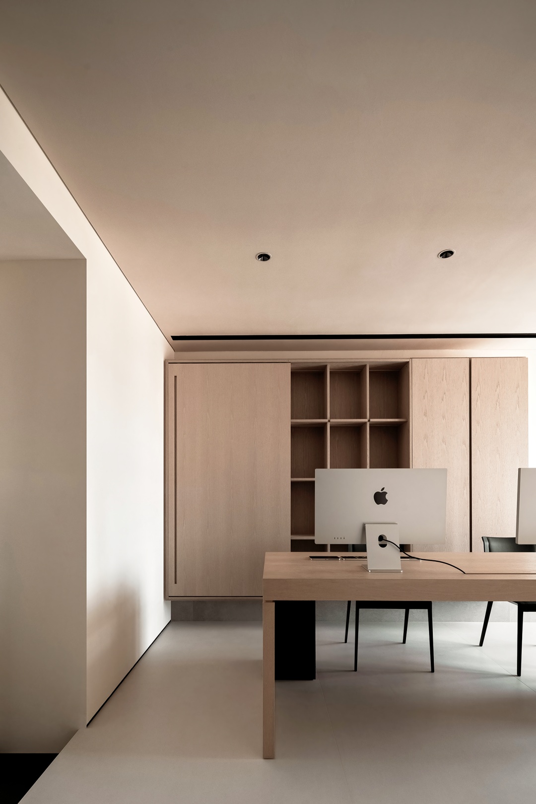 自然原木色系讓人不禁沉浸下來,輕靈純粹的空間氣韻直擊心靈,在這里思考、激發、輸出。自由移動的隱形門,關上,書房是一個靈感生產容器;打開,再次回歸純粹的生活里。