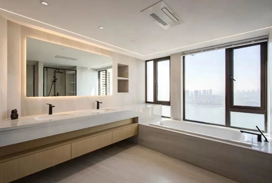主衛(wèi)用了四分離的機(jī)構(gòu),四個(gè)功能區(qū)有連接,也有區(qū)隔。大規(guī)格的啞光磚,讓空間更舒展大氣。